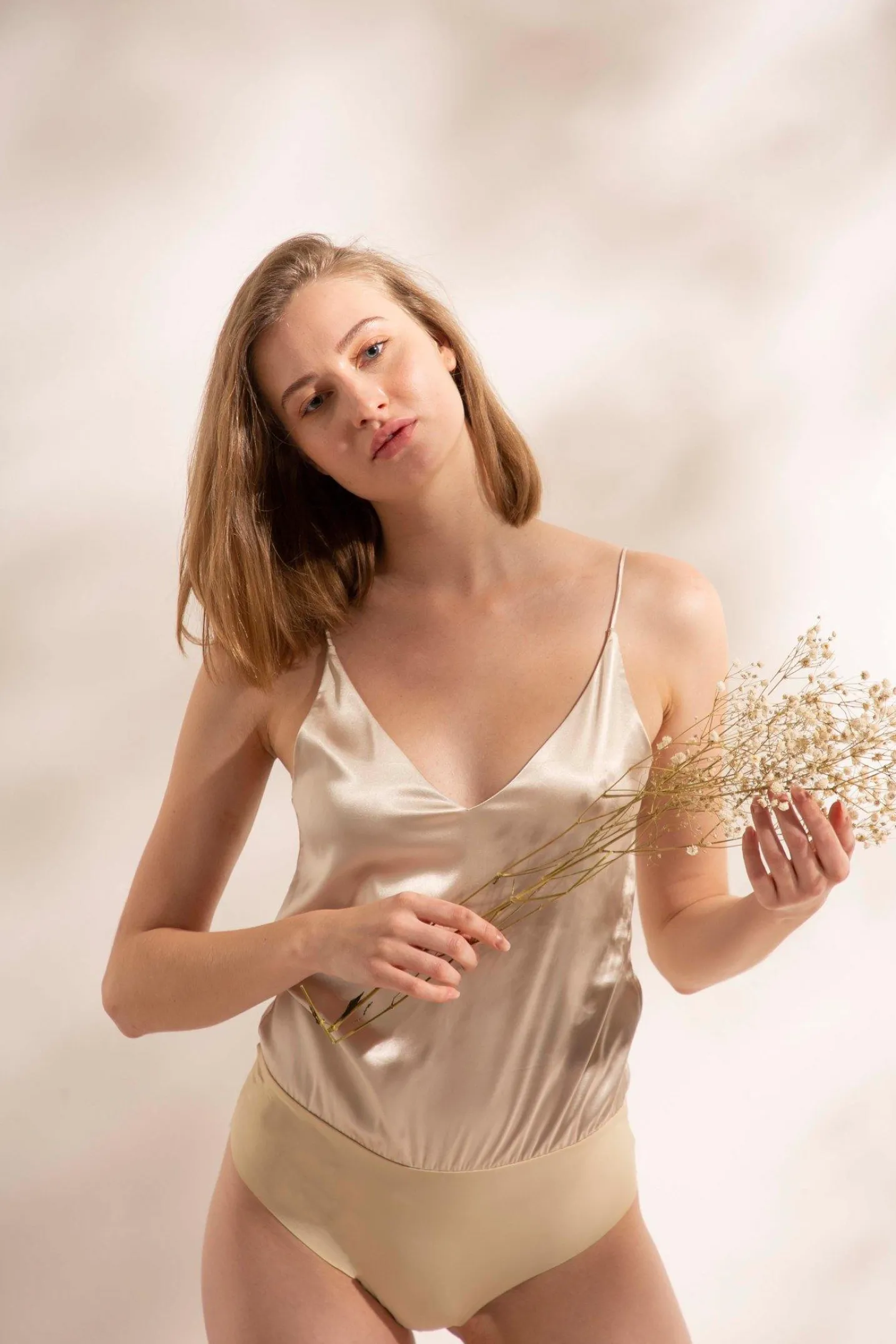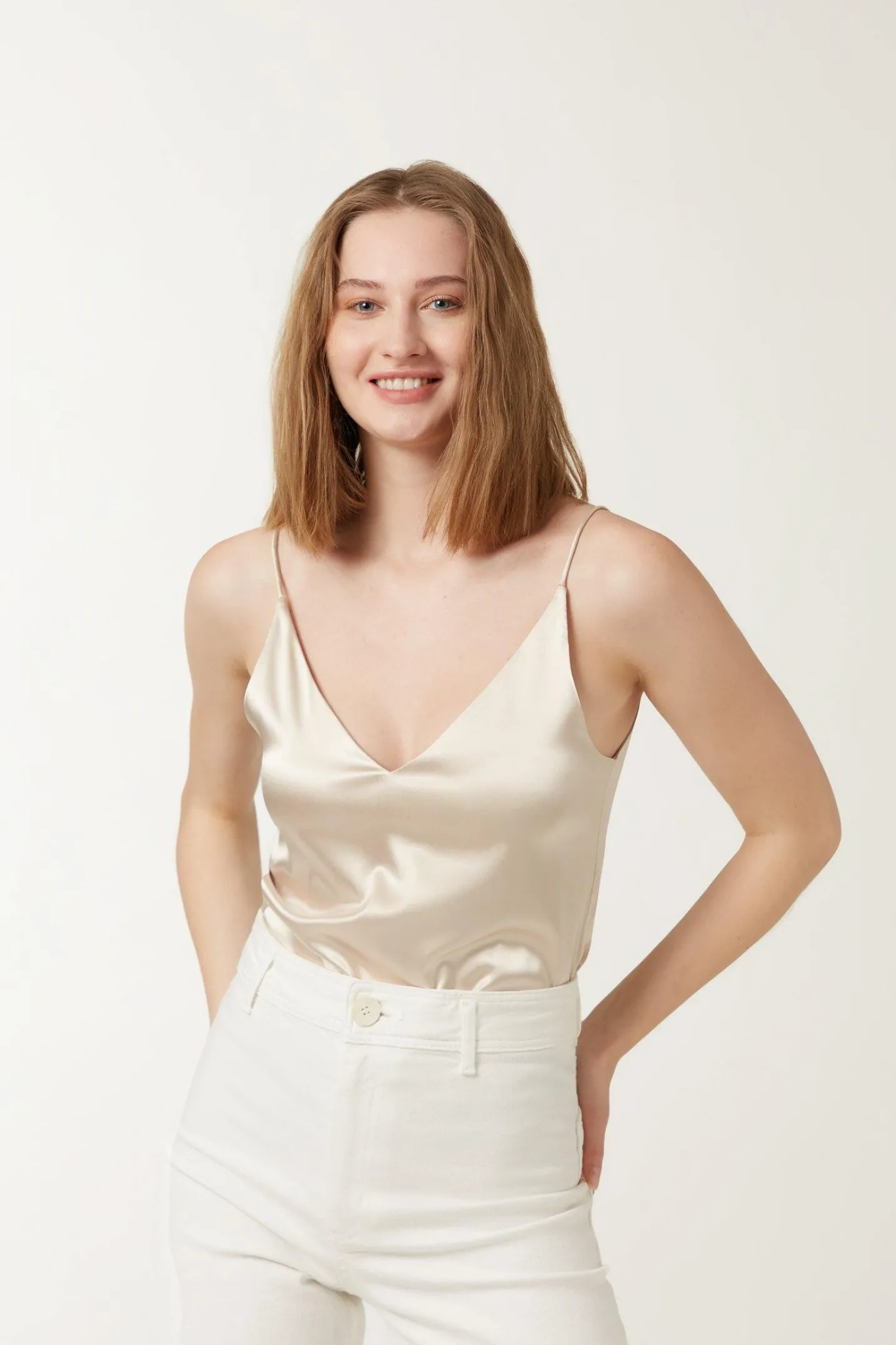 Gentle, soft, and gracefully beautiful— GINA is draped to fit your body with a dual-fabric design. Featuring spaghetti straps and a v-neckline, GINA is a camisole bodysuit suitable for business and casual.