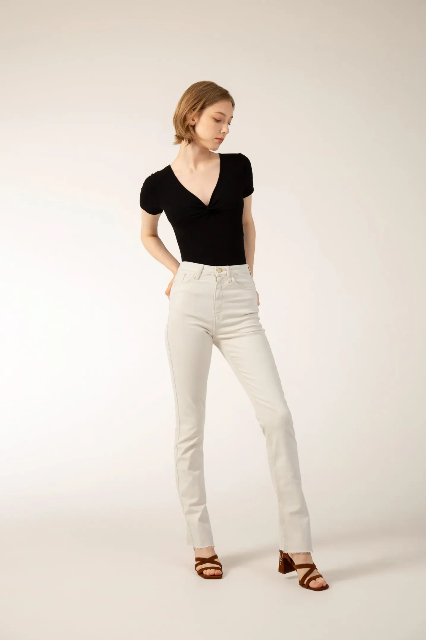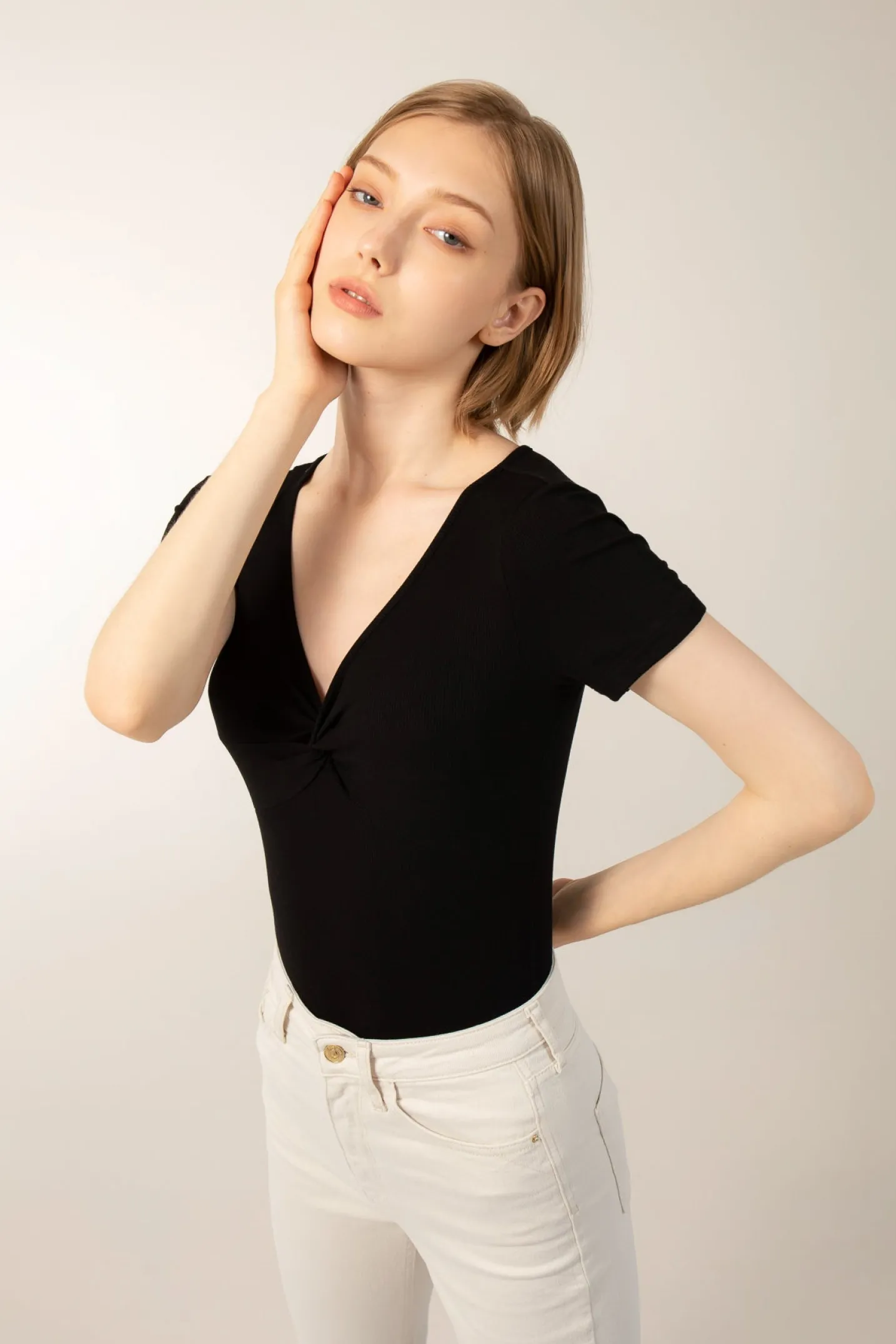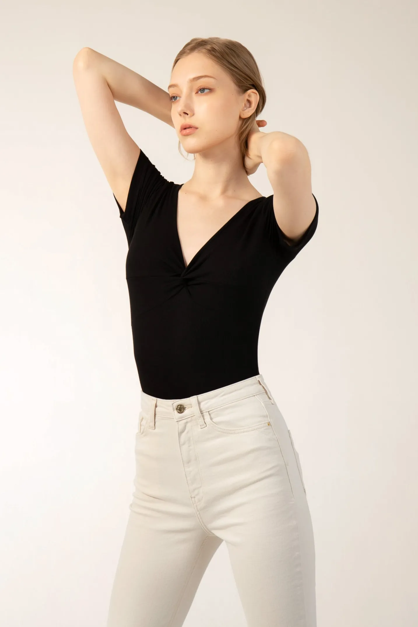 Simply a flattering v-neck that fits better, looks better, and feels better. Comes with a subtle knot front detail and a upward waistline, JACE highlights your collarbone modestly with class. The bodysuit is made of a soft and comfy modal-blend material so that it tucks perfectly into any jeans or pants.