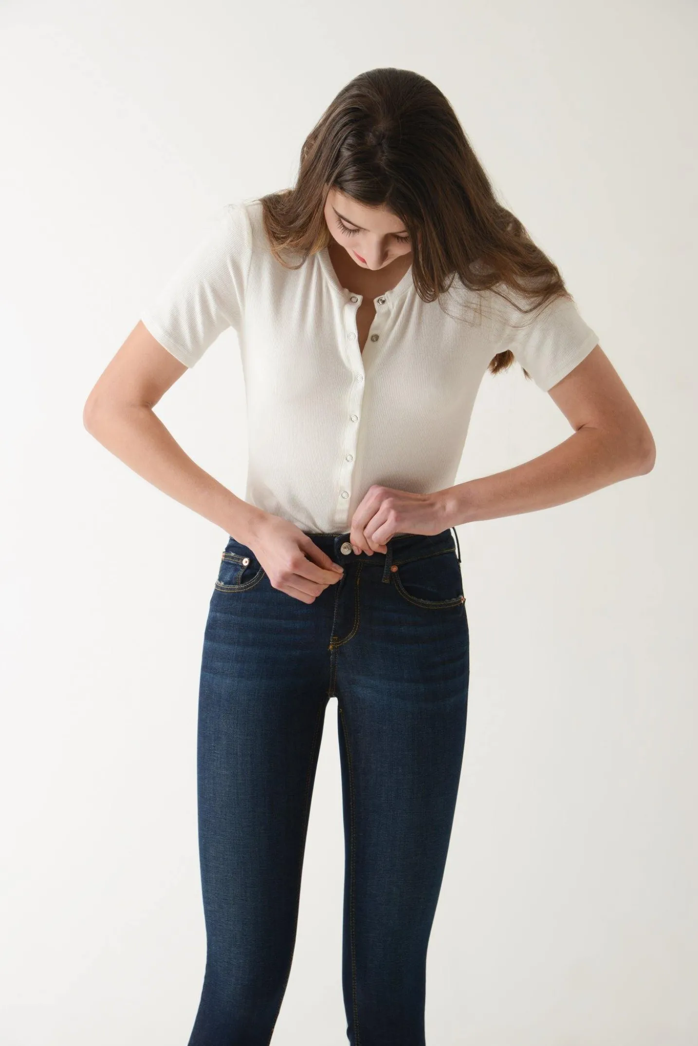 ‘KAT body’ is a button down bodysuit featuring six gunmetal snap closures and a fine rib collar. The piece offers an extra spin on a regular short-sleeved bodies. Button up or down to suit your mood. The rib fabric is unusual, the modal blend has greatly softened the touch and added extra glamour to the look. Your pick to stay comfortable and effortlessly stylish. Wash cold.