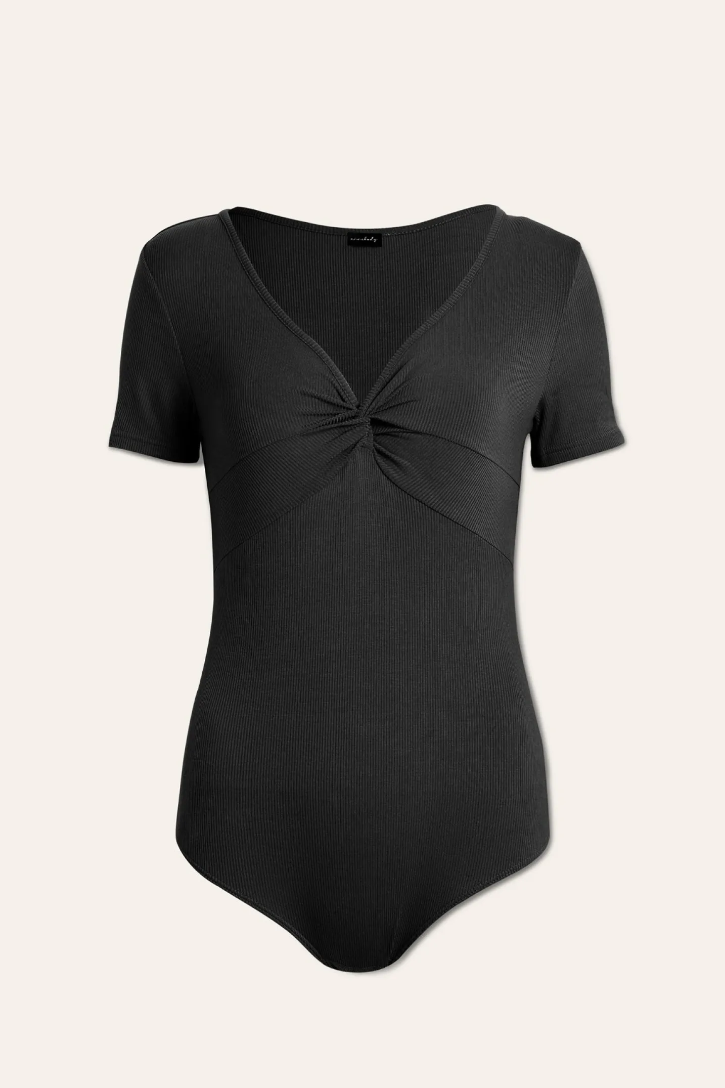 Simply a flattering v-neck that fits better, looks better, and feels better. Comes with a subtle knot front detail and a upward waistline, JACE highlights your collarbone modestly with class. The bodysuit is made of a soft and comfy modal-blend material so that it tucks perfectly into any jeans or pants.